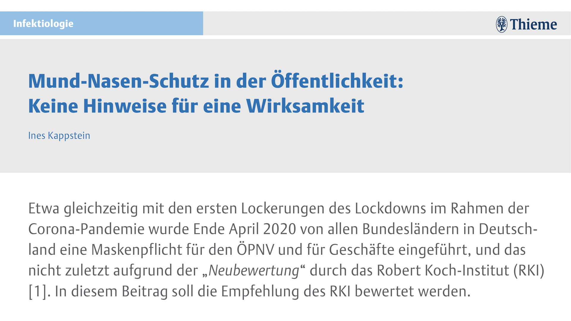 Weder vom RKI oder von der WHO noch von ECDC oder CDC wurden wissenschaftliche Daten für eine positive Wirkung von Masken in der Öffentlichkeit (im Sinne einer reduzierten „Ausbreitungsgeschwindigkeit von COVID-19 in der Bevölkerung“[1]) vorgelegt, weil es solche Daten nicht gibt [1][6][7][8][9]. Hinweise siehe im PDF-Dokument auf der thieme-Webseite