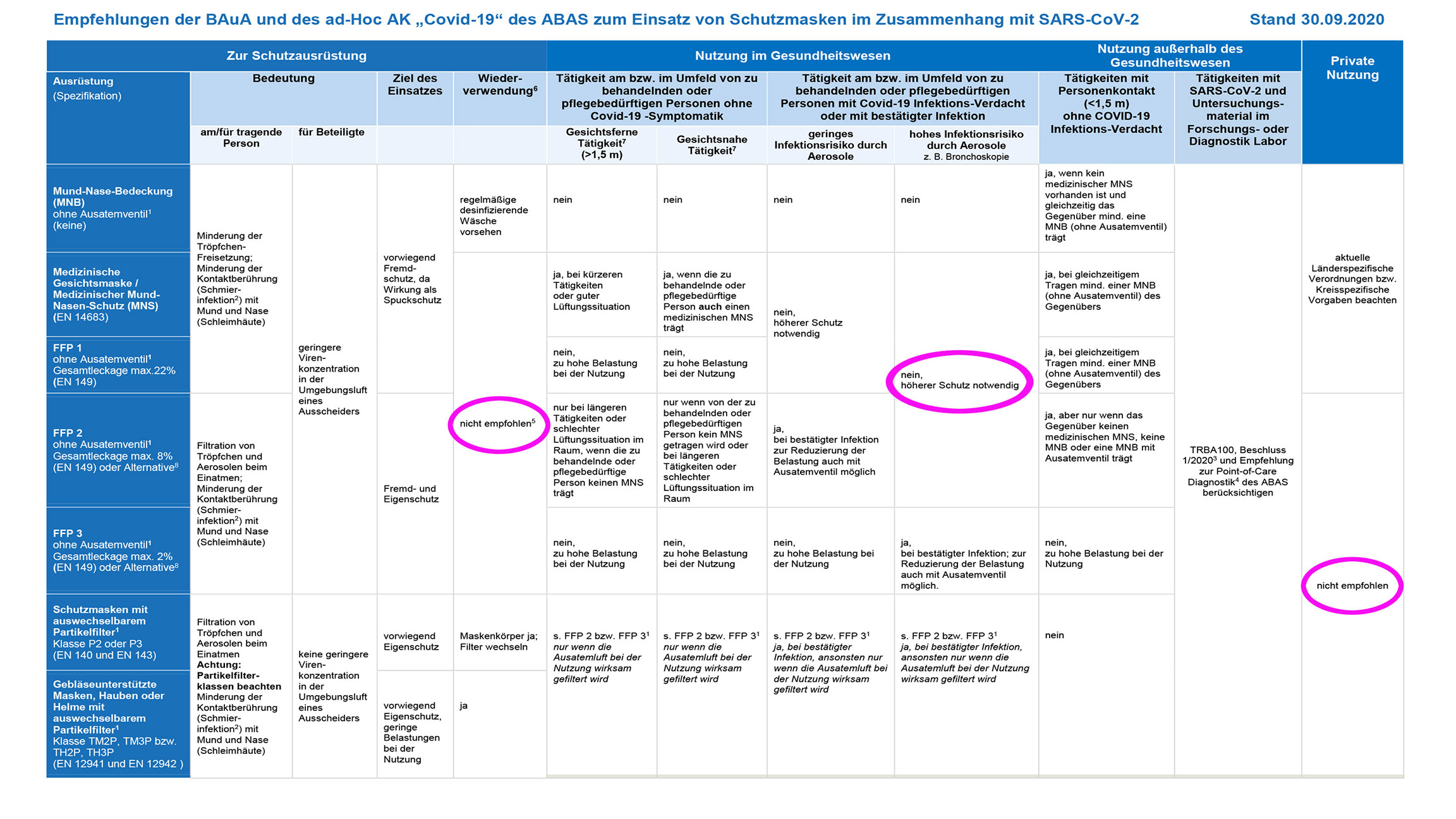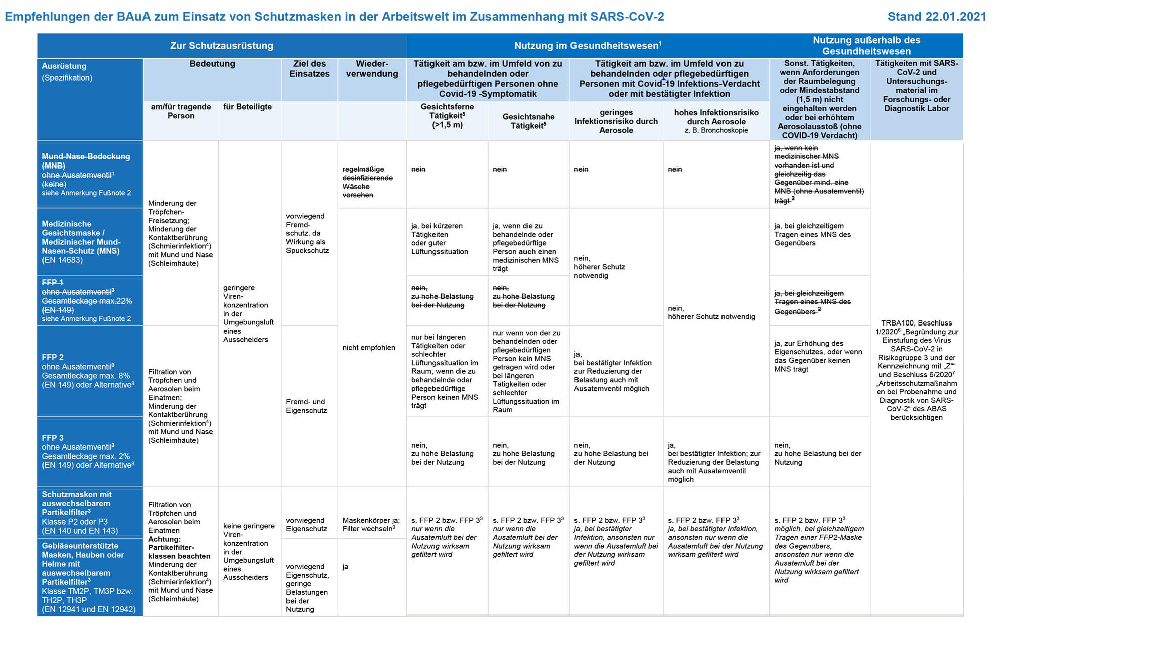 Die entsprechende Tabelle mit den Einschätzungen ist geändert worden. Die in der Fassung vom 30.9.2020 noch zu findende Spalte „Private Nutzung“ ist in der neuen Fassung gelöscht. In der vorherigen Fassung (hier noch zu finden) war zu lesen, dass die FFP2-Masken nicht zur privaten Nutzung empfohlen werden. Diese Aussage war vom Robert-Koch-Institut (RKI) zitiert worden, ist aber in der neuen Fassung der Hinweise zu Infektionsschutzmaßnahmen vom 22.1.2021 ebenfalls gelöscht worden