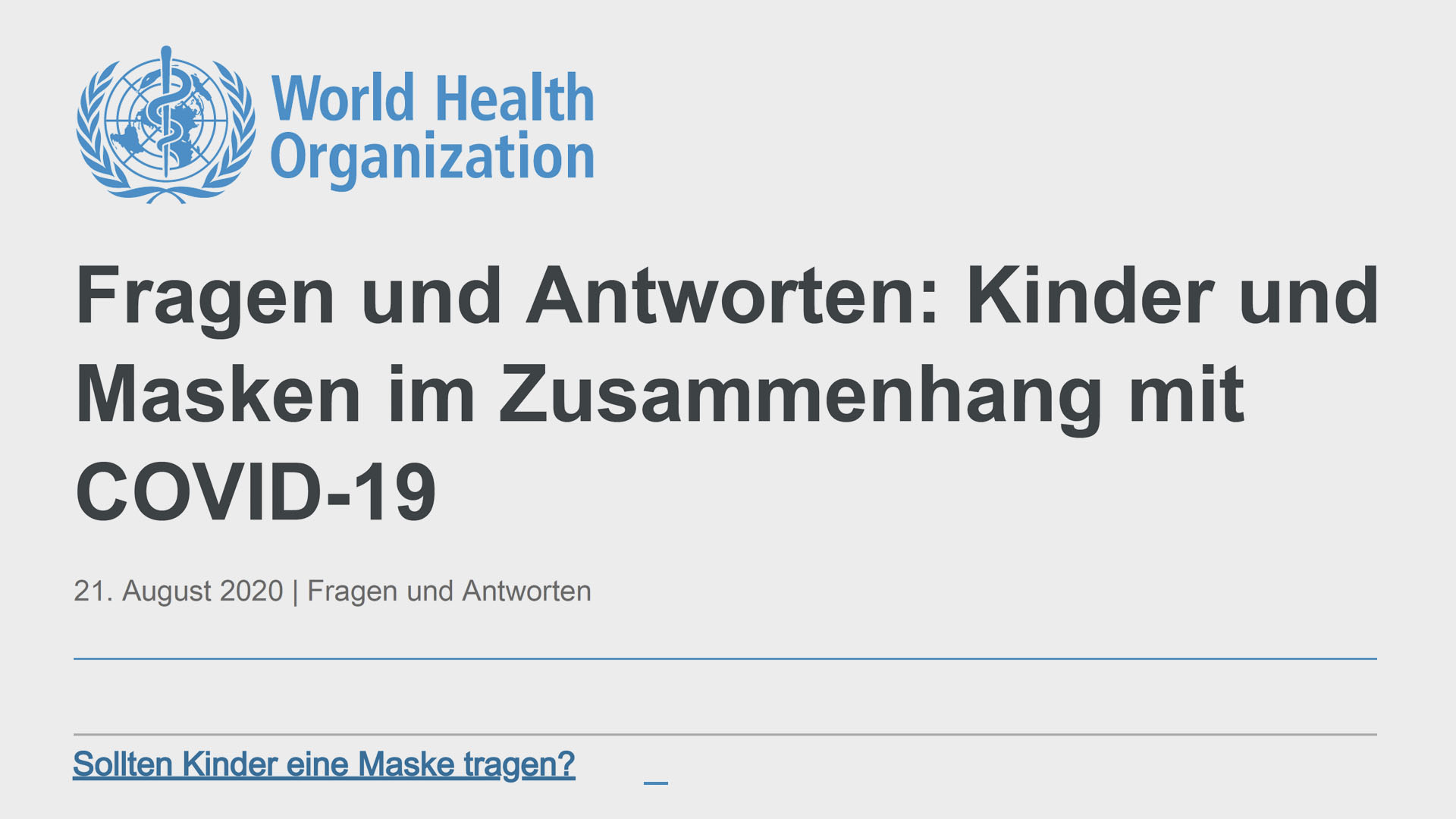 Unter der Überschrift: Ratschläge zur Verwendung von Masken für Kinder in Gemeinschaft im Zusammenhang mit COVID-19 – ein Textauszug.