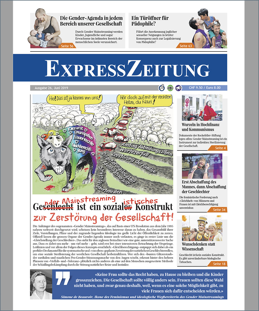 Die Anhänger des sogenannten «Gender Mainstreamings», das auf Basis einer UN-Resolution aus dem Jahr 1995 nahezuweltweit durchgesetzt wird, scheinen kein besonderes Interesse daran zu haben, das Gesamtbild ihrer Ziele, Vorstellungen,Pläne und der zugrunde liegenden Ideologie ins grelle Licht der Öffentlichkeit zu zerren. Offiziell lassen die grossen Organe der Gender-Agenda immer noch verlauten, es ginge in erster Linie um die «Gleichstellung der Geschlechter». Das sieht für den arglosen Betrachter wie eine gute,unterstützenswerte Sache aus. Dass es dabei um mehr - um viel mehr – geht, wird erst bei einer intensiveren Betrachtung der Ursprünge, Leitlinien und vor allem der Folgen dieses Konzepts ersichtlich: «Gleichberechtigung entpuppt sich dabei als ein perfider Deckmantel für die systematische und «von oben» geplante Zerstörung der natürlichen Geschlechterrollen, um eine soziale Sterilisierung der westlichen Gesellschaft herbeizuführen. Wer sich den «bunten Glitzerstaub» der medialen und staatlichen Pro-Gender-Stimmungsmache von den Augen wischt, erkennt hinter den hehren Phrasen von «Vielfalt» und «Toleranz» plötzlich nichts anderes als eine auf den Menschen ausgeweitete Methode der Schädlingsbekämpfung durch die Störung natürlicher Reize und Instinkte......