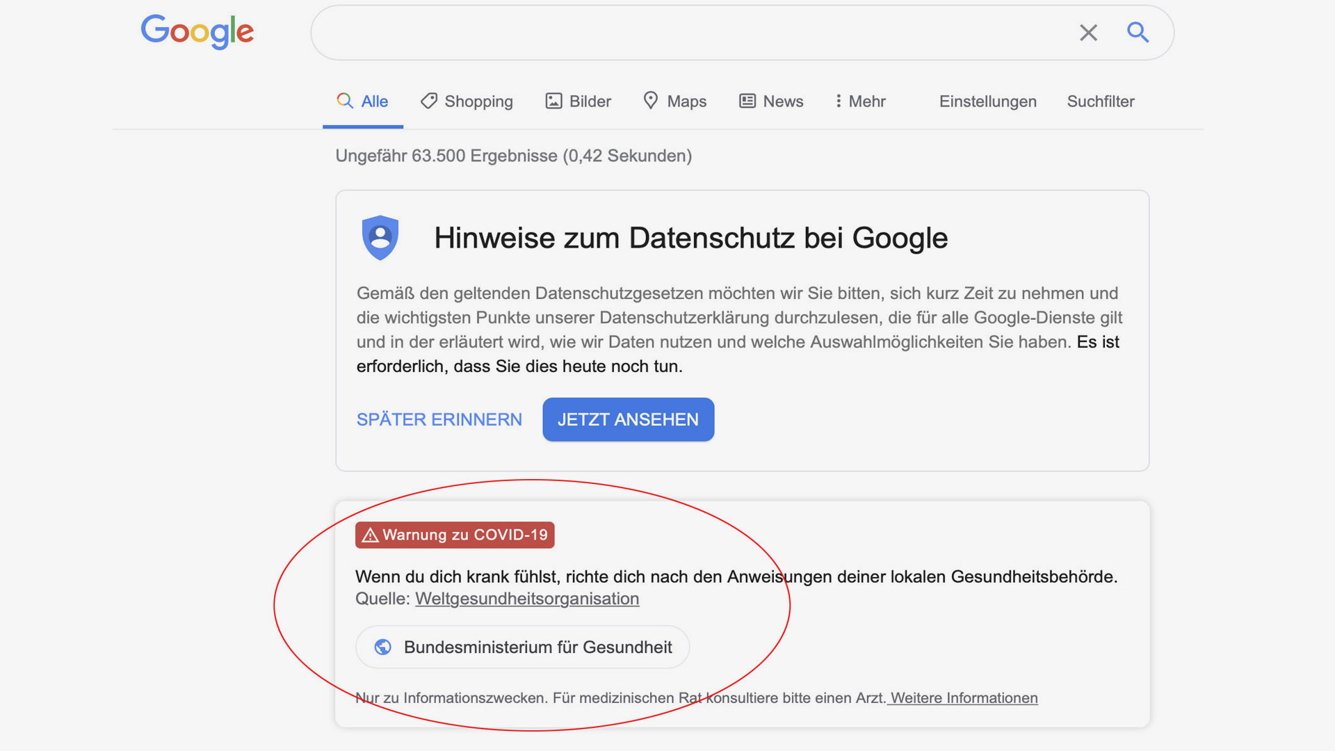 Bereits im März 2020 begann Google als Unterstützer der WHO Werbe-Hinweise unterhalb der Suchanfrage anzuzeigen wie: "Warnung zu Covid-19" und Verlinkung auf das Bundesministerium für Gesundheit. Hierzu veröffentlichte die Ebner Media Group GmbH & Co. KG auf Ihrer Webseite internetworld.de den Artikel: