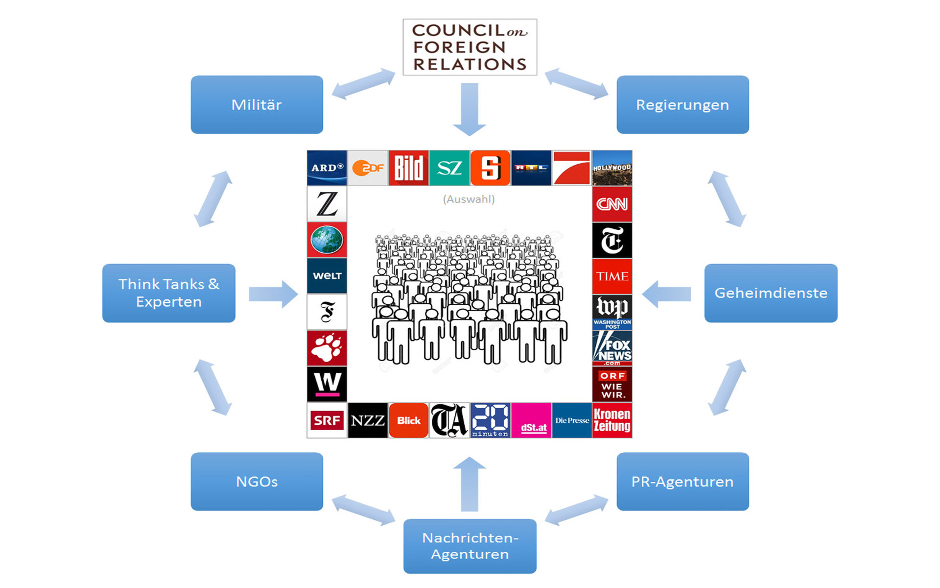 Globale Agenturen, oder die großen Infopools aus denen die meisten Zeitungen, Illustrierten, TV-Sender "gespeist" werden bzw. ihre "Nachrichten" erhalten. Propaganda wäre als Umschreibung sicher der bezeichnendere Begriff statt Information. So entsteht eine gleichgeschaltete Medienland- schaft. Wie in der Darstellung angedeudet bedienen vier Presseagenturen hauptsächlich den Infomarkt iin unseren deutschsprachigen Raum: dpa, REUTERS, AP, AFP