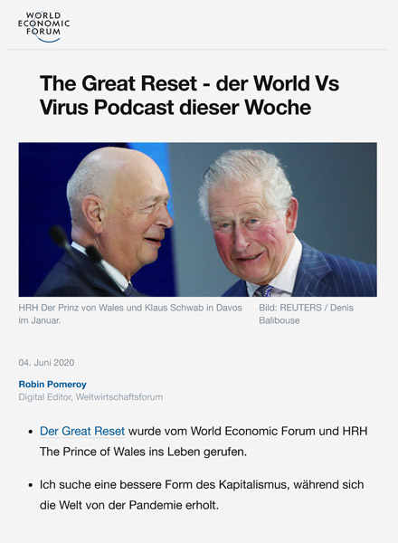 Die WEF Ankündigung des Great Reset erfolgte durch HRH The Prince of Wales und Professor Schwab während eines virtuellen Treffens, gefolgt von Erklärungen von UN-Generalsekretär António Guterres und IWF-GF/CEO Kristalina Georgieva –> LINK:::